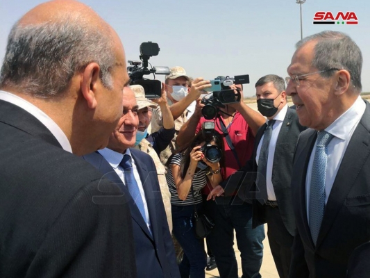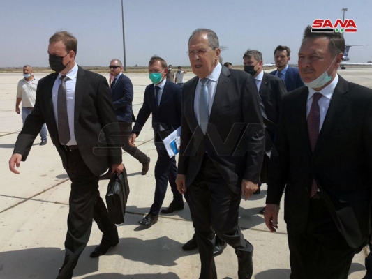 من استقبال وزير الخارجية الروسي سيرغي لافروف في مطار دمشق الدولي