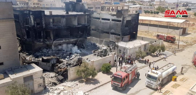 من الأضرار التي خلفها الحريق الذي نشب بأحد معامل الدهانات في المدينة_الصناعية بحلب