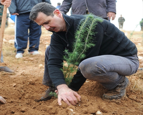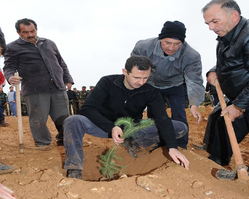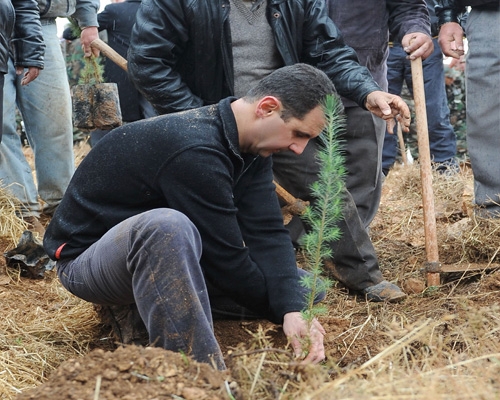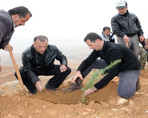 الرئيس الأسد يشارك بحملة التشجير التي تقوم بها وحدات من القوات المسلحة في جبل العرمة بقطنا
