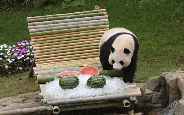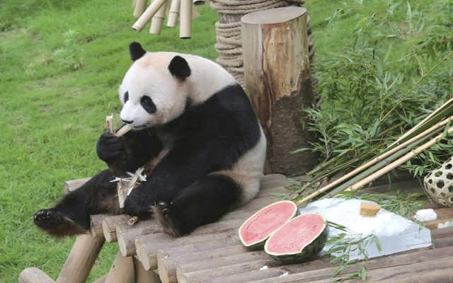 باندا مدلل يحتفل بعيد ميلاده بكعكة من البامبو