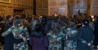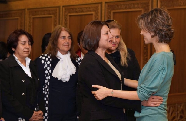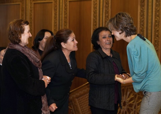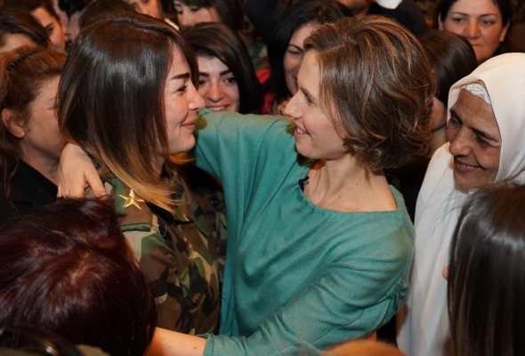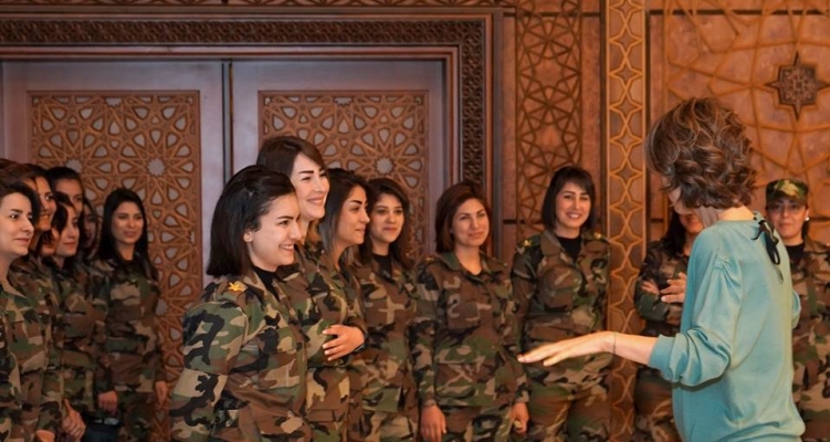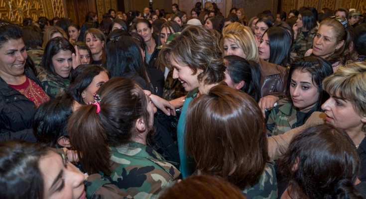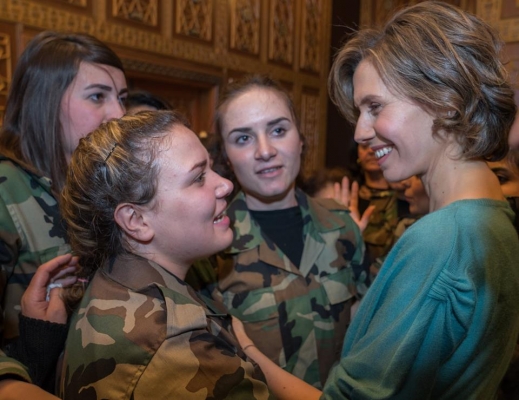 السيدة أسماء الأسد خلال استقبالها مقاتلات الغوطة مع أمهاتهن في عيد الأم 2018