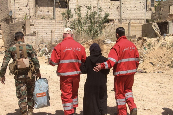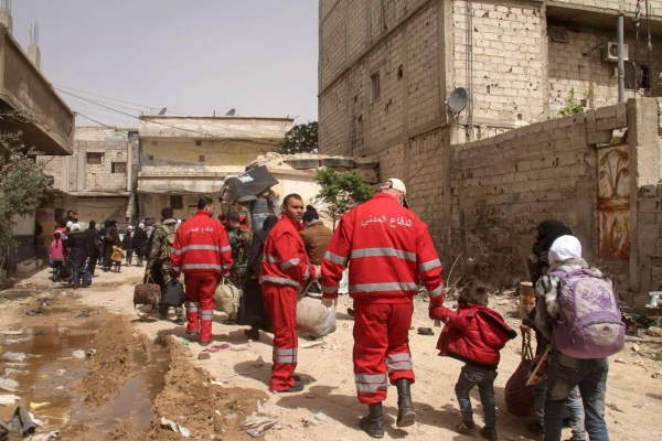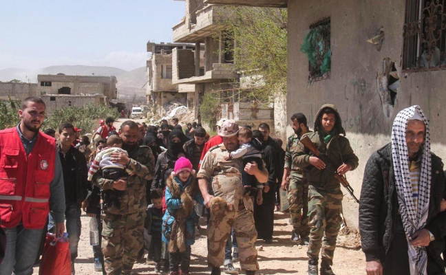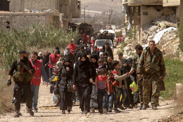 خروج مئات المدنيين المحتجزين لدى الإرهابيين في دوما عبر ممر مخيم الوافدين