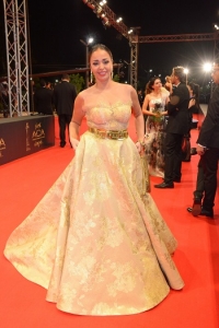 داليا البحيرى بفستان دهبي من تصميم بهيج حسين وتعتبر هذه المرة الأولي التى ترتدي من تصميمات