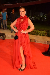 داليا مصطفى بفستان أحمر طويل من تصميم عبده أمين