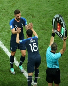 وانتهى الشوط الأول بتقدم فرنسا على كرواتيا بهدفين لهدف، وبدأ الديوك الشوط الثاني بنفس سياسية الأول باللعب على الهجمات المرتدة مع ترك السيطرة على الكرة لكرواتيا.
