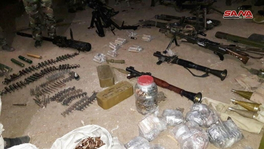 بالصور.. أسلحة وذخائر من مخلفات الإرهابيين ببلدة عقرب بريف حماة الجنوبي بعضها إسرائيلي الصنع
