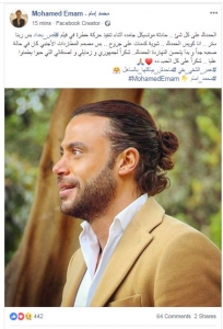 وكتب محمد إمام عبر فيس بوك: "الحمد لله على كل شىء.. حادثة موتسيكل جامدة أثناء تنفيذ حركة خطرة فى فيلم لص بغداد بس ربنا ستر.. أنا كويس الحمد لله.. شوية كدمات على جروح.. بس مصمم المطاردات الأجنبى كان فى حالة صعبة جداً وبدأ يتحسن النهاردة الحمد لله".