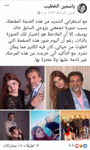 وأضافت الخطيب: "ولمّا ازدادت الشائعات رواجاً، اضطررت إلى دحضها بتأكيد زواجي من مخرج وسياسي مصري، فسهُل على الفضوليين فكُّ اللغز باسم المخرج والبرلماني خالد يوسف، وقامت على إثر القصة عاصفة على السوشيل ميديا، صحبتها أخرى على المستوى الشخصي، هدأت بإعلاني طلاقي عبر صفحتي الرسمية على فيسبوك".
