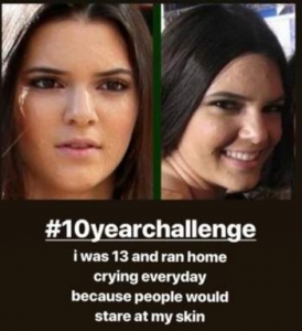 صدمت نجمة تلفزيون الواقع كيندال جينر بعد أن خاضت تحدي العشر سنوات بطريقتها الخاصة مستغلةً إياه لإيصال رسالة بسبب معاناتها مع حب الشباب من قبل.