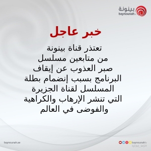 ونشرت القناة بيانا عبر حسابها الموثق على تويتر، قالت فيه: " تعتذر قناة بينونة من متابعين برنامج صبر العذوب عن إيقاف البرنامج بسبب إنضمام بطلة المسلسل لـ قناة الجزيرة التي تنشر الإرهاب والكراهية والفوضى في العالم"