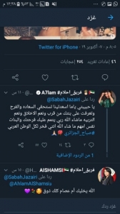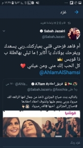 شاركت صباح الجزائري تغريدة احلام على حسابها وكتبت معبرة عن فرحتها بهذه المباركة" أم فاهد فرّحتي قلبي بمباركتك..ربي يسعدك ويفرحك بولادك يا أكابر ! ما تبلي بهالطلة ب ذا ڤويس