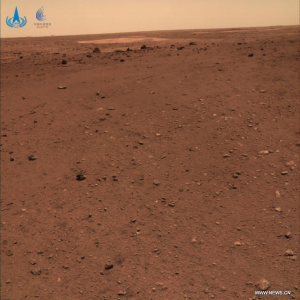 وتظهر صورة أخرى العلم الوطني الصيني مرفوعا من منصة الهبوط المتلألئة على الكوكب الأحمر، والتقطتها مركبة التجوال بعد تحركها لمسافة ستة أمتار بزاوية 60 درجة إلى الشرق من جنوب منصة الهبوط.