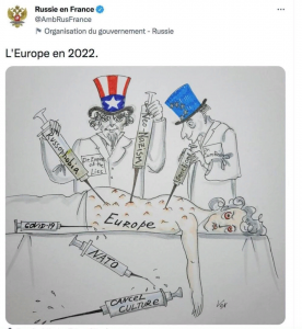 ويظهر هذا الرسم الذي نشرته السفارة الروسية على حسابها في "تويتر" جسما مريضا راقدا على طاولة عمليات جراحية كتب عليها "أوروبا"، وفوقها طبيبان يرتديان قبعتين تحملان علمي الولايات المتحدة والاتحاد الأوروبي واسماهما "إمبراطورية الأكاذيب" و"الرايخ الأوروبي"، وهما يعطيان المريض حقنا خبيثة كتب عليها "كراهية روسيا" و"العقوبات" و"النازية الجديدة" و"كوفيد-19" و"الناتو" و"ثقافة الإلغاء".