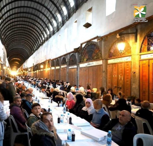 أقامت الشركة السورية للحرف بالتعاون مع تجار وحرفي دمشق القديمة اليوم إفطارا جماعياً "مائدة الورود" لنحو 1650 شخصاً في سوق مدحت باشا بدمشق القديمة ووزعت 400 وجبة إفطار في المدينة القديمة.