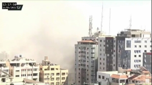 الإحتلال الإسرائيلي يقصف برج الجلاء السكني وسط مدينة غزة ويدمره بالكامل